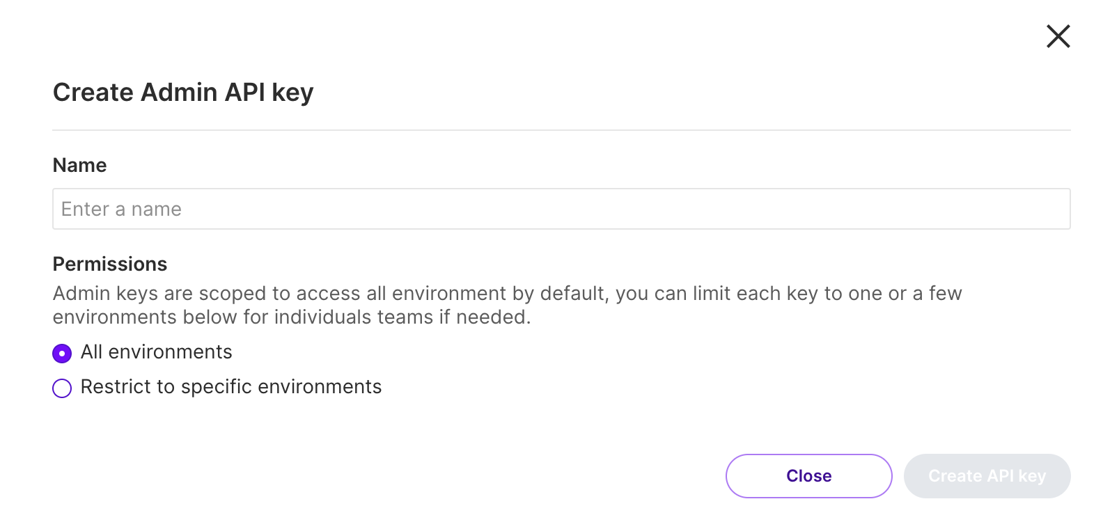 Select All environments or Restrict to specific environments to control the restrictions that this API Key has access to. If you select Restrict to specific environments, select one or more environments that the key has access to in one project.