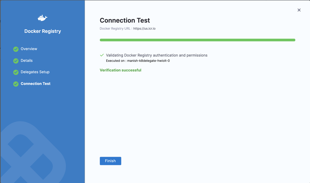 Harness tests the credentials you provided using the delegates you selected.