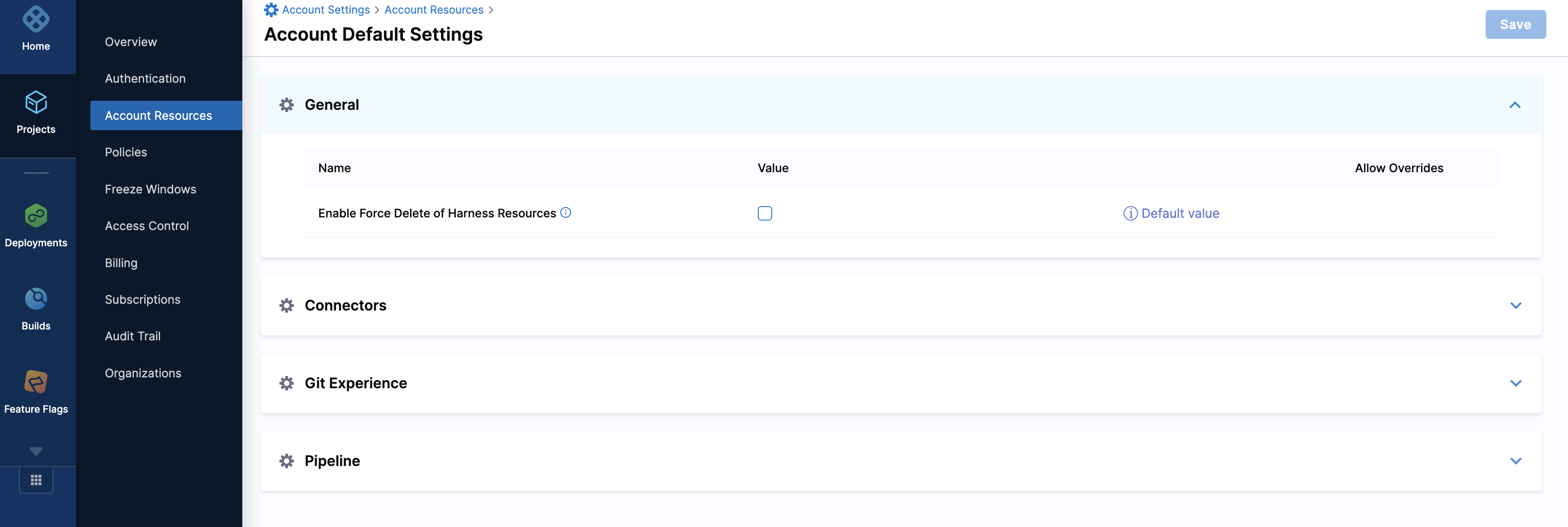 The Harness account admin can enable or disable the force delete option in the account's default settings. It is generally recommended that this setting be turned on only for brief periods due to the interconnectivity nature of the Harness entities.