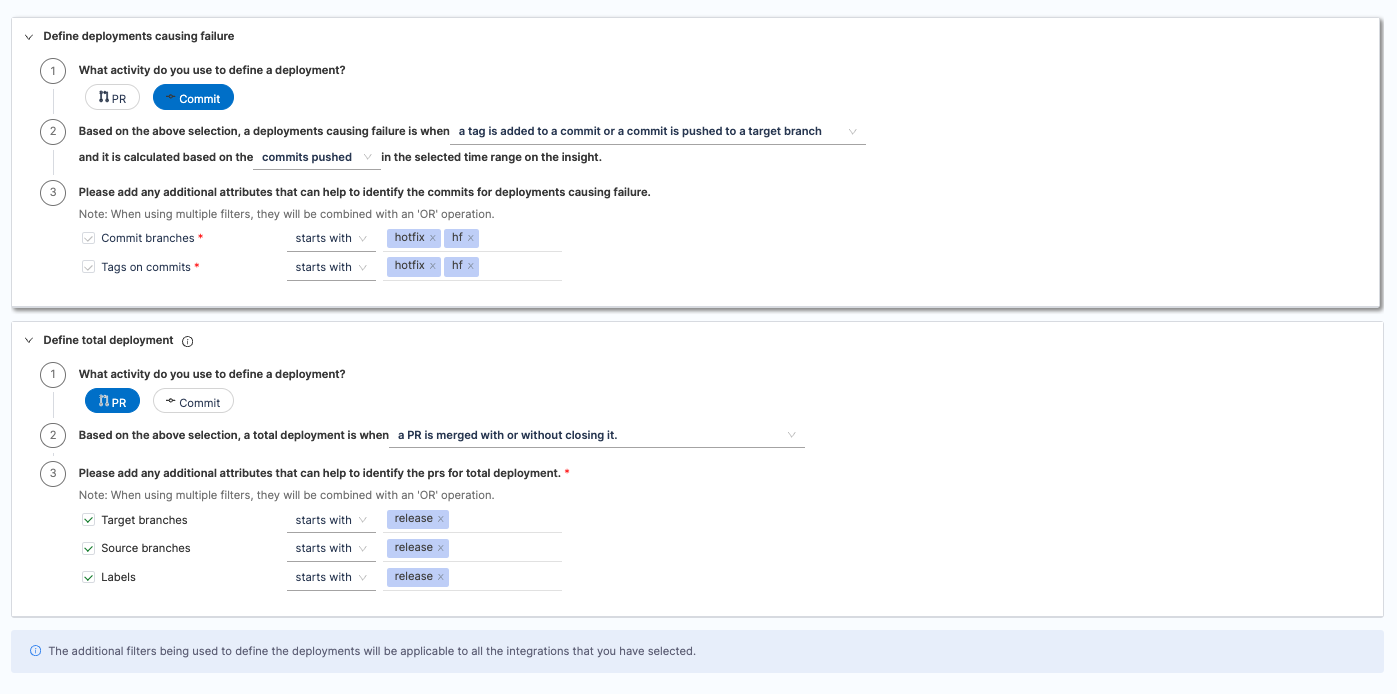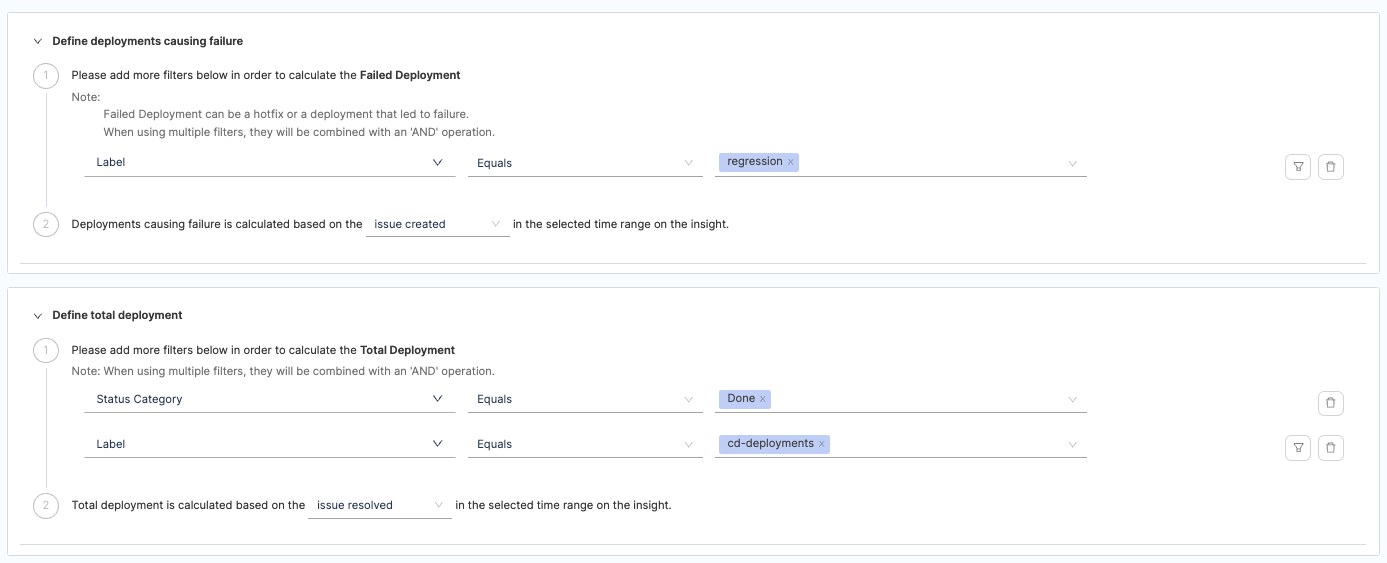 - Configure additional attributes to define deployments that result in failure or total deployments. When applying multiple filters, they will be combined using an 'AND' operation. A failed Deployment can be a hotfix or a deployment that led to failure.