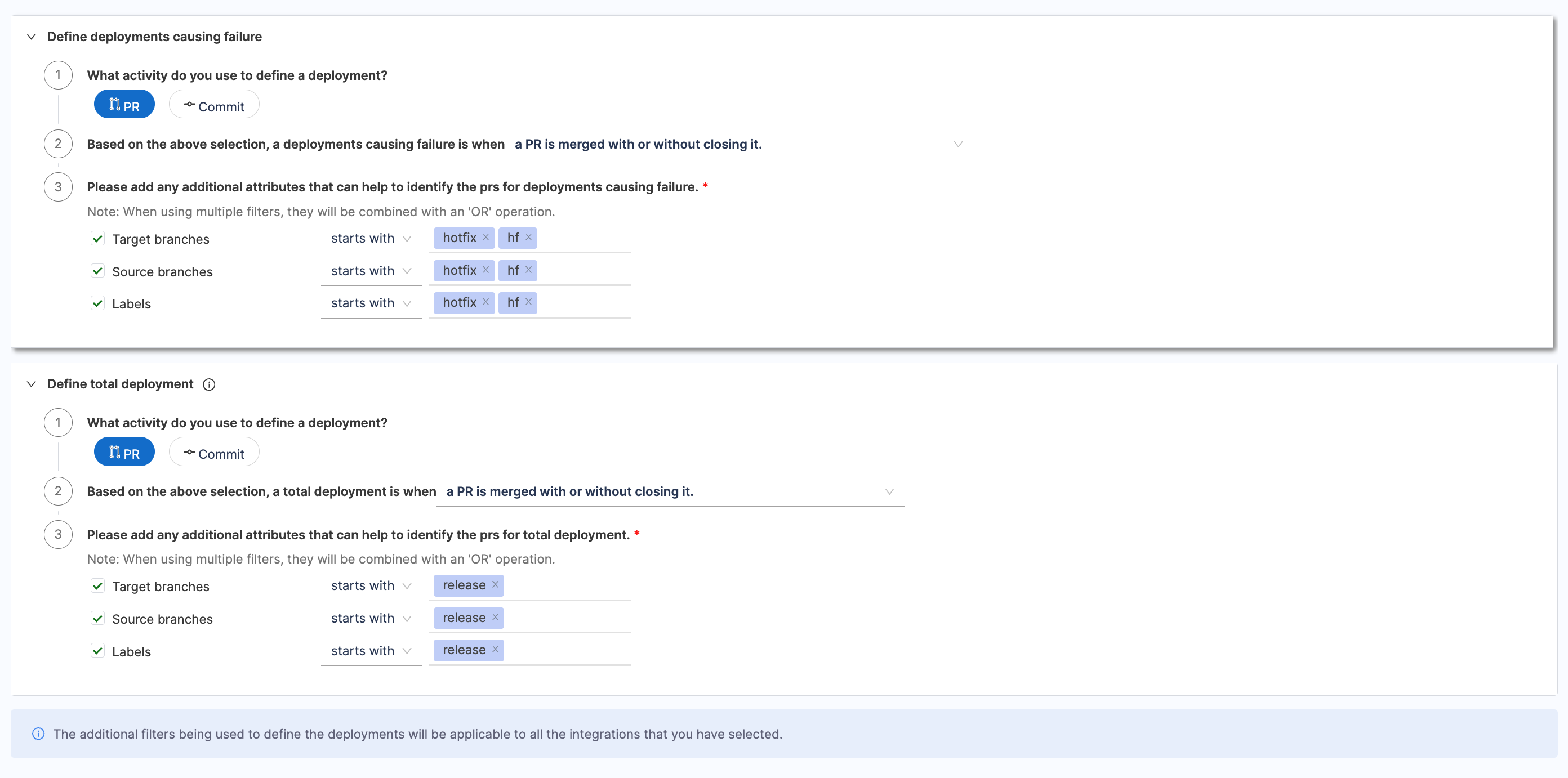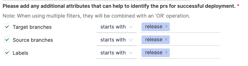 Add any extra attributes that help identify PRs for deployments causing failure. Multiple filters are combined using an 'OR' operation.