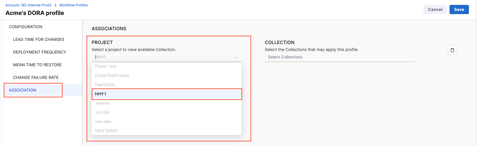 Note that for calculating DORA metrics, each profile can be associated with only one Collection in a one-to-one mapping