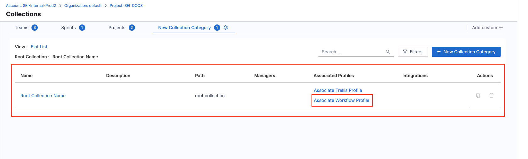 - To associate a DORA profile with the existing Collections, click on the Associate Workflow Profile option under the Associated Profiles column.