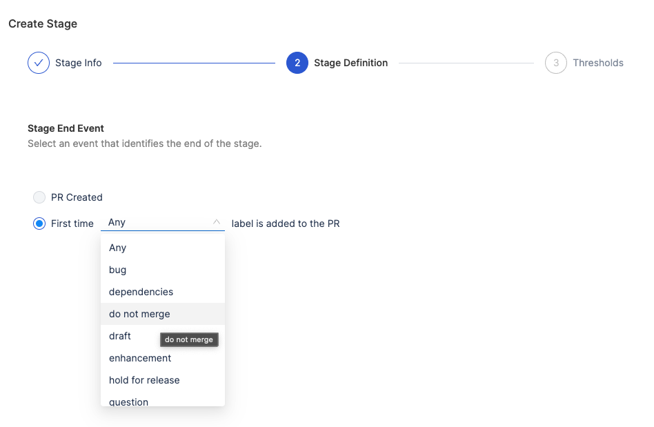 - Select an event that identifies the end of the stage (e.g., PR Created or specific labels added to the PR).